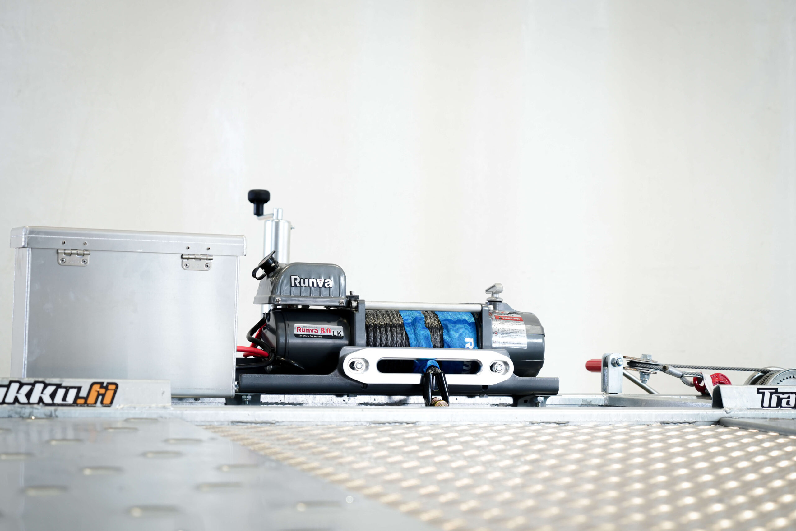 Sisältää mm: vinssin, vinssijalan, akkukotelon, akun, asennuslevyn ja vinssihupun