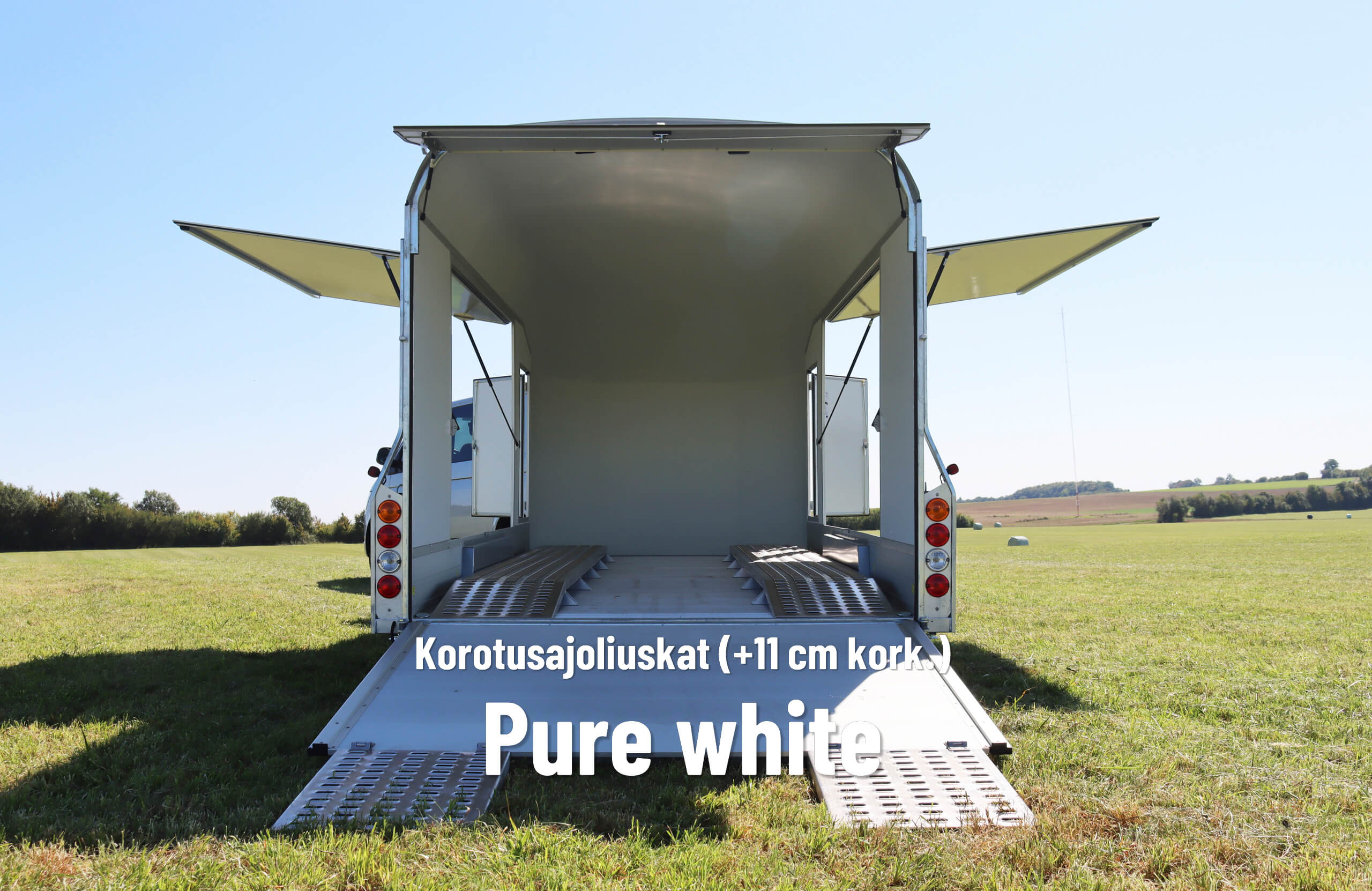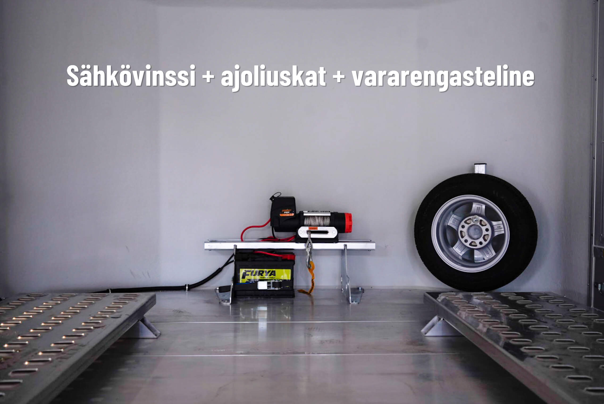 | Lisävarusteet mm. | Sähkövinssi (2000kg, 3000kg, 3629kg), korotusajoliuskat (+11 cm kork.), langaton wifi-peruutuskamera, alumiinivanteet, ajoramppien lyhyet jatko-osat, ajoramppien pitkät jatko-osat, rengaskiilat sisälle (2 kpl, autolle), rengasteline sisälle |