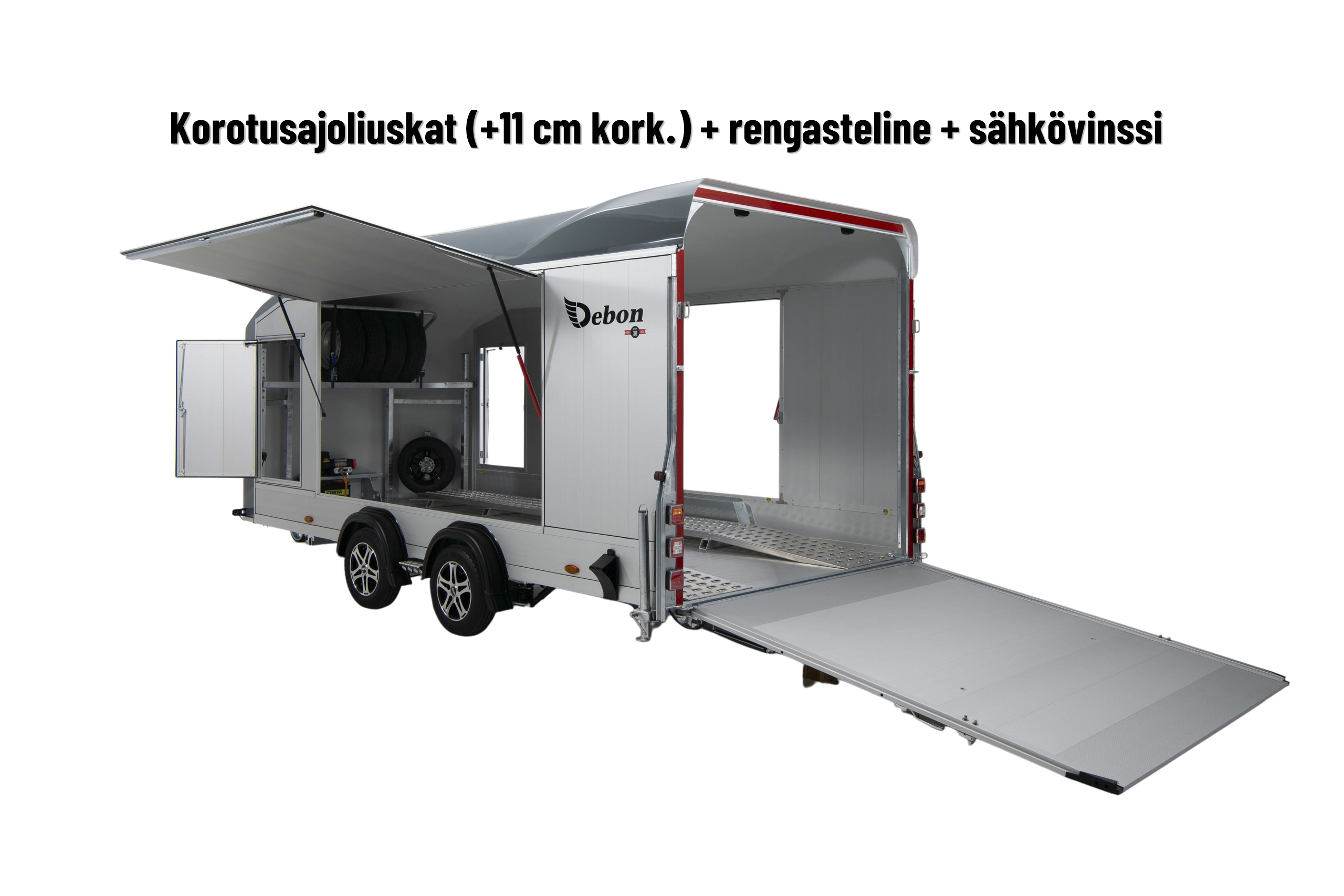 Debon Roadster C1000 on uuden sukupolven umpinainen autonkuljetustraileri, joka yhdistää näyttävän muotoilun, älykkäät ratkaisut ja tinkimättömän käytettävyyden. Olipa kyse moottoriurheilusta tai ajoneuvojen kuljetuslogistiikasta. Traileri on varustettu myös tunnetulla Pullman 2 -jousitusjärjestelmällä, joka vaimentaa tehokkaasti iskuja ja takaa poikkeuksellisen ajomukavuuden. 3500 kg (saatavana myös 2700 kg) kokonaismassa tekee siitä täydellisen kumppanin autoille. Suuret sivuille aukeavat ovet yhdessä molemmin puolin sijaitsevien sivuovien kanssa tekevät lastauksesta ja purkamisesta sujuvaa ja esteetöntä. Sisäpuolen tehokas LED-valaistus varmistaa, että työskentely onnistuu myös hämärässä ja yöllä. Takarampin mitat, (L) 205 cm ja (K) 190 cm, mahdollistavat monenlaisten ajoneuvojen kuormaamisen – pienistä kilpureista isompiin kuljetustarpeisiin. Vaunun järeä rakenne ja viimeistelty yksityiskohtaisuus tekevät siitä luotettavan työkalun päivittäiseen käyttöön, ja samalla sen moderni ulkoasu tuo lisäarvoa niin ammattilaiselle kuin harrastajallekin. Alumiinilattialla ja anodisoiduilla alumiiniseinillä varustettu traileri kestää erinomaisesti vaativissakin olosuhteissa. Kuvien alumiinivanteet, korokeliuskat, kamera, rengasteline, rengas-stopparit, lisärampit saatavilla lisävarusteena!