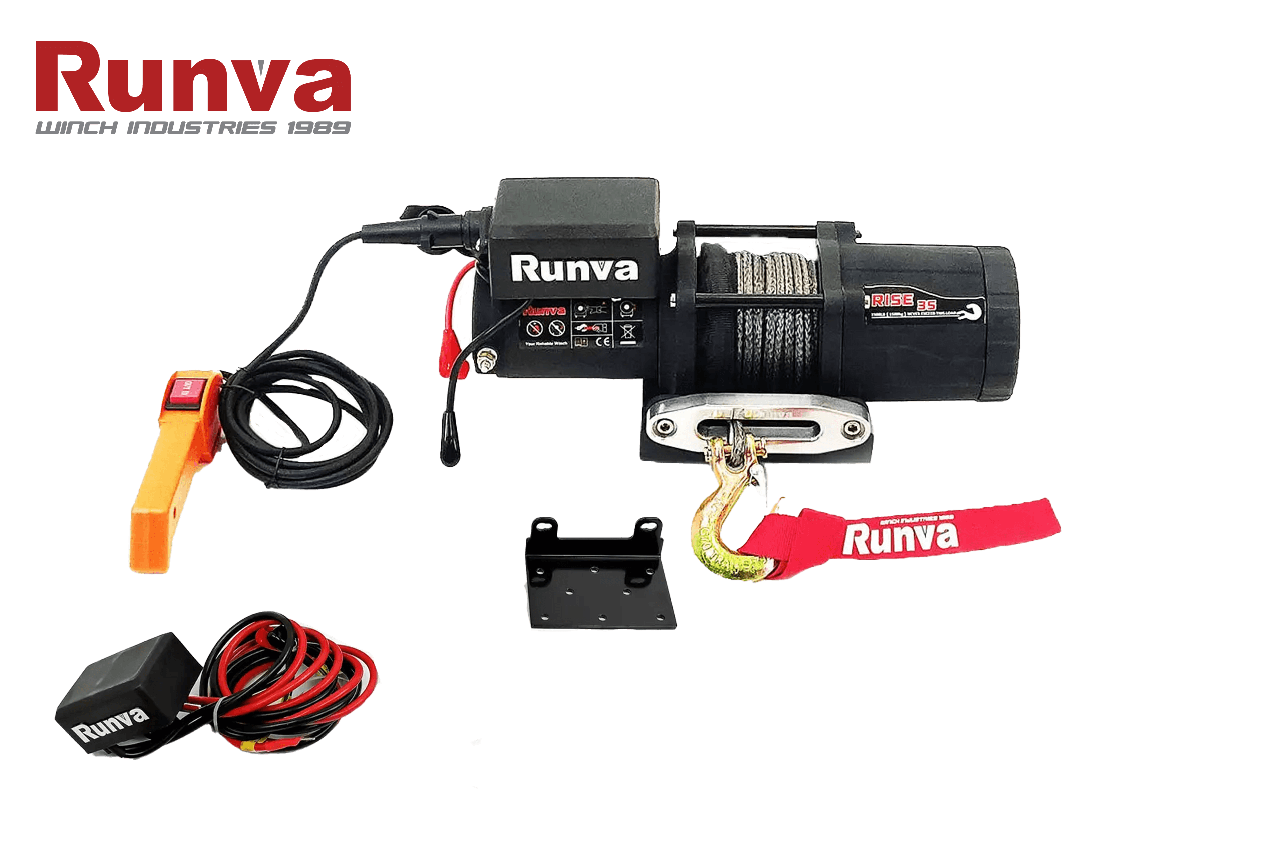 Runva RISE35 (30th Anniversary) on hinta-laatusuhteeltaan erinomainen sähkövinssi mönkijään, veneeseen, traileriin ja monipuoliseen vetokäyttöön. Uudistettu Rise-sarja tarjoaa nopeamman 166:1 välityssuhteen sekä erittäin vahvan 3-tasoisen planeettapyörästön – enemmän voimaa ja nopeampi köyden kelaus. Suunniteltu kestämään vaativaa käyttöä, kuten mönkijän OFFROAD-ajoa Suomen olosuhteissa. Paketti sisältää kaiken tarvittavan nopeaan käyttöönottoon: Vinssin, Dynemax-köysi, koukku ja merkkiliina, liukukita, asennusrauta ja pultit, johtosarja, releyksikkö, langallinen kaukosäädin ja käyttökytkin.